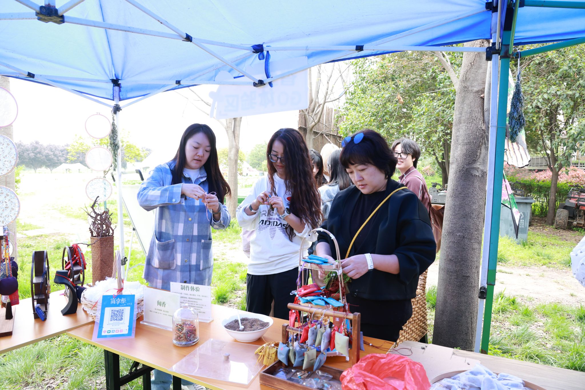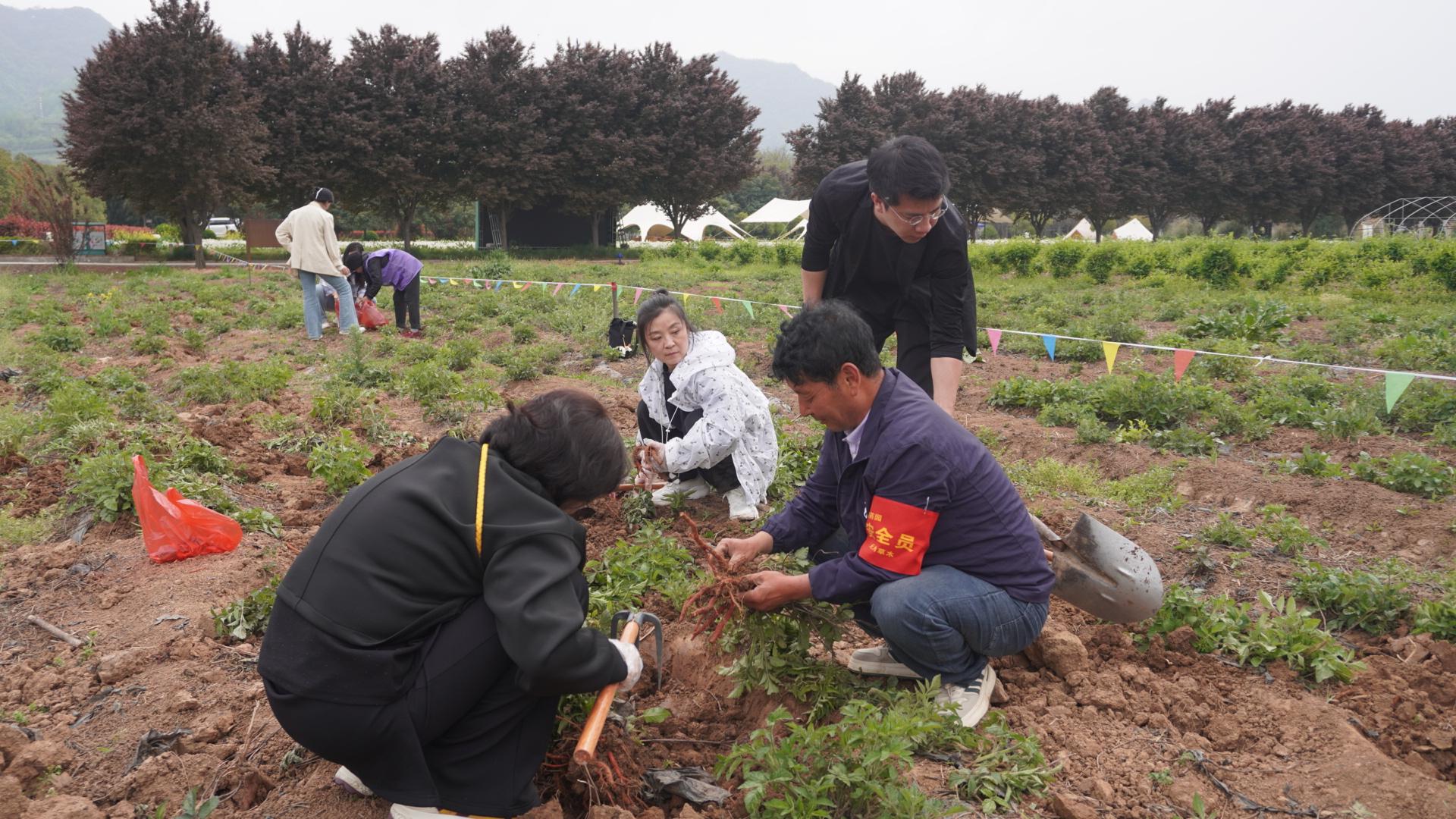 实践体验环节,师生们积极参与“采药王”挑战,在老药农指导下亲手采挖丹参,获得“采药人身份卡”,沉浸式体验传统采药技艺。参与者还分组体验了古法澡豆制作、香囊DIY、足浴包配制、丹参切片及养心菜盆栽种植等手作项目,将本草文化与生活美学紧密结合,进一步拓展了美育实践的边界。